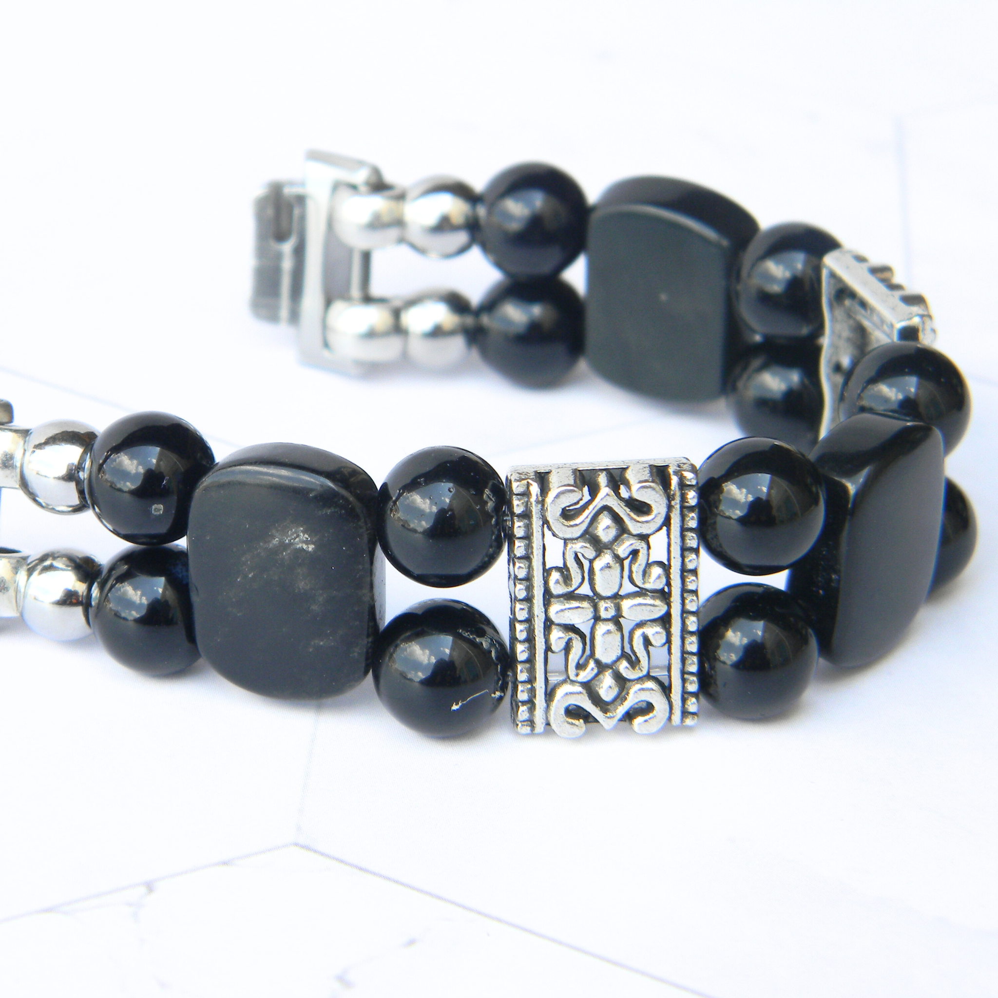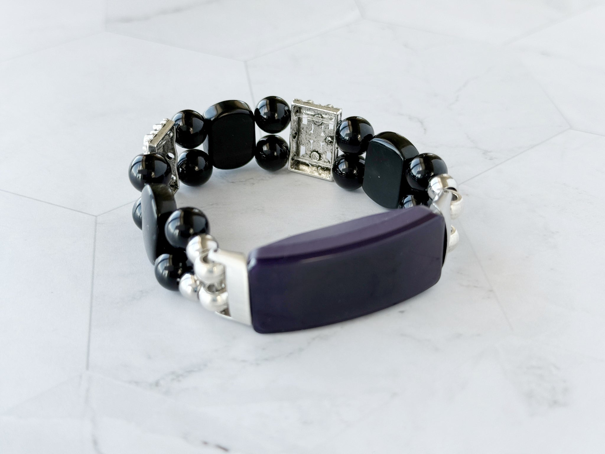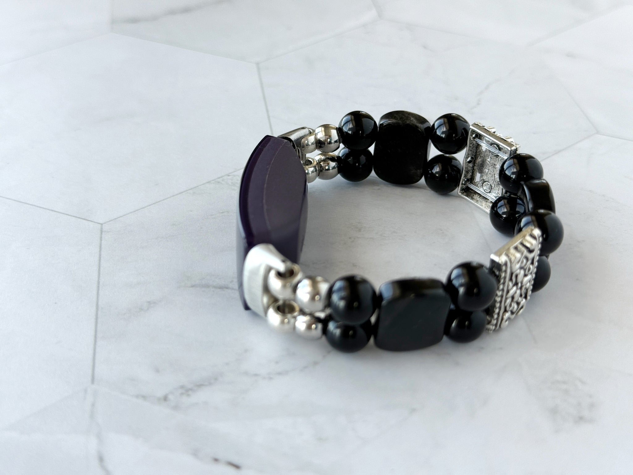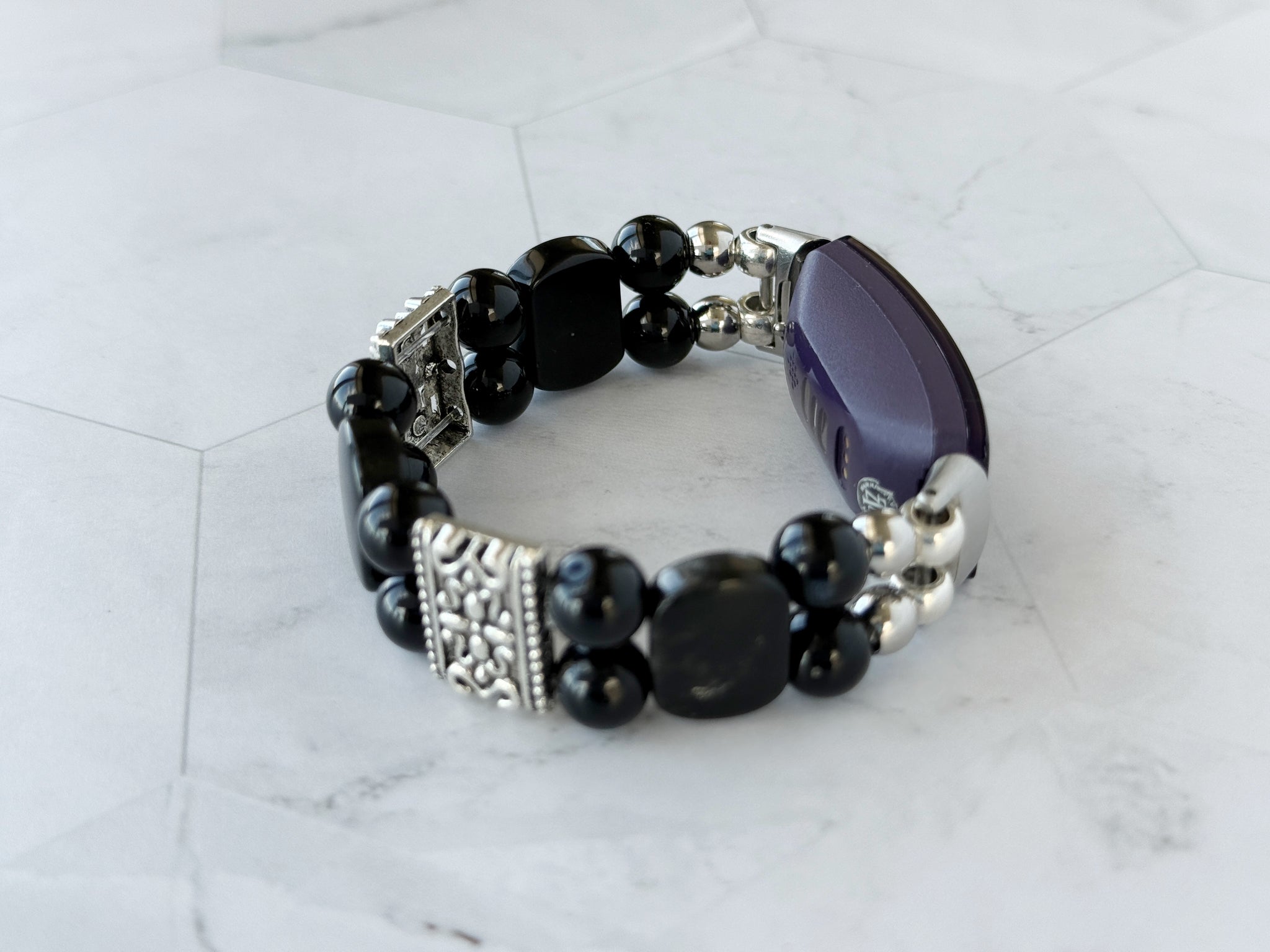 Elevate your FitBit Inspire 3 with this handcrafted Black Onyx and Obsidian beaded stretchy watch band. Its sleek, natural stones add a touch of sophisticated elegance, transforming your smartwatch into a stylish accessory perfect for any occasion. Durable and comfortable, this band combines beauty with function to enhance your daily wear.