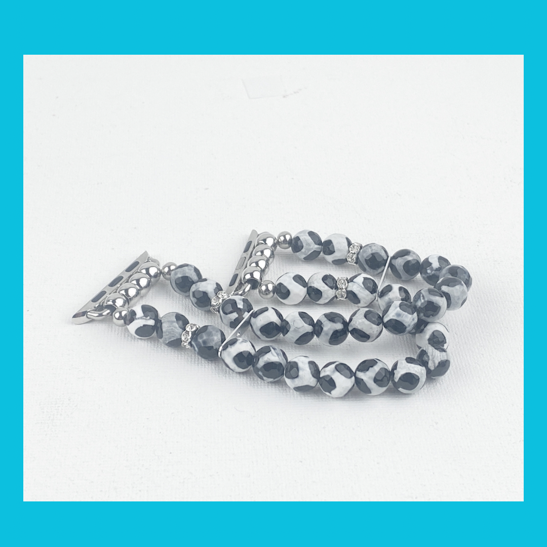 Watch band is made with Black and White beads. Beads are Black Onyx with White. These beads are paired with rhinestone spacers and metal bar spacers. This watch band is stretchy for easy on and off.